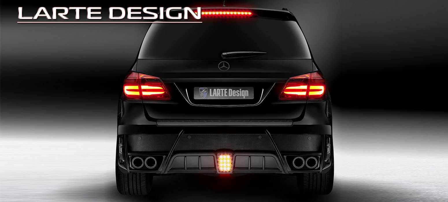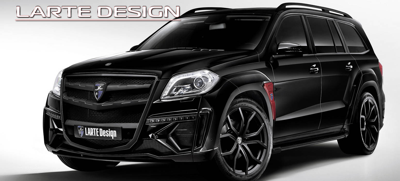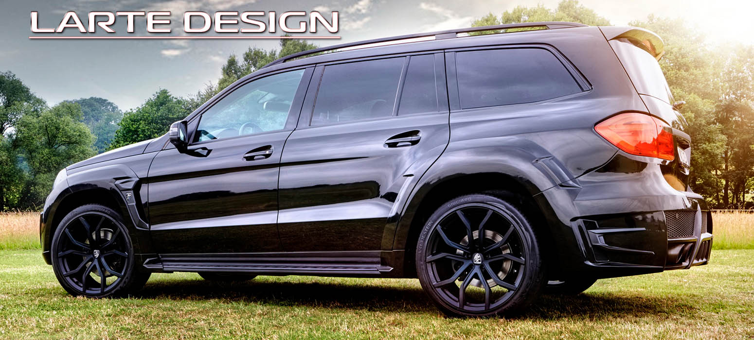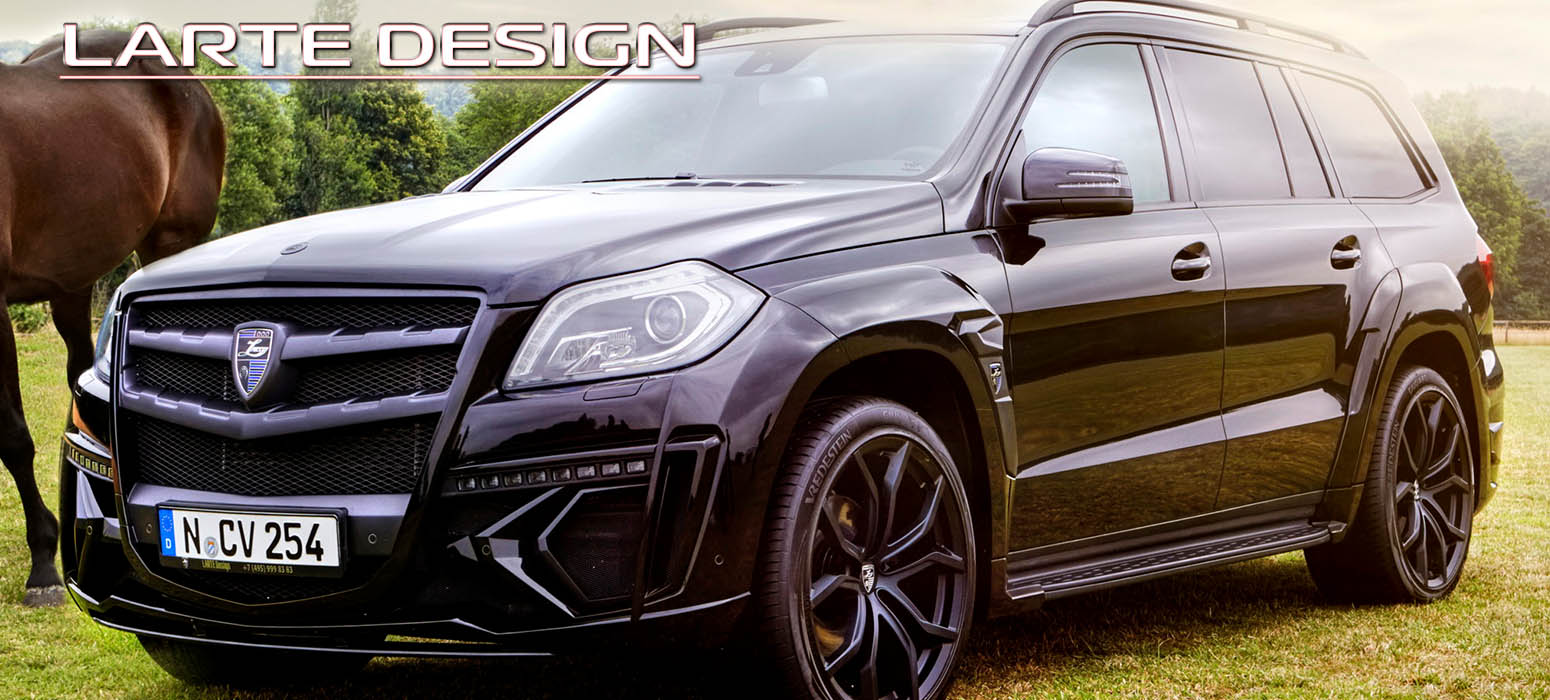И на "закуску" можем рассказать об обвесе на семейство GL/GLS X166 от отечественного производителя Larte Design. Их комплект Black Cristall иногда встречается на машинах московского региона и не только. Особенностью дизайна этого комплекта является огромная решетка радиатора в виде щита на переднем бампере.