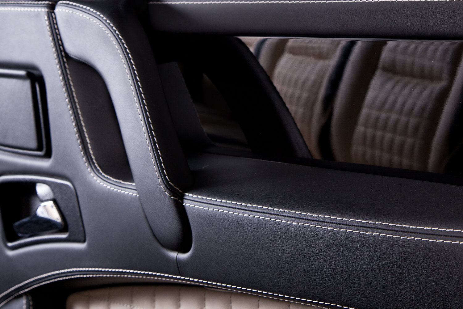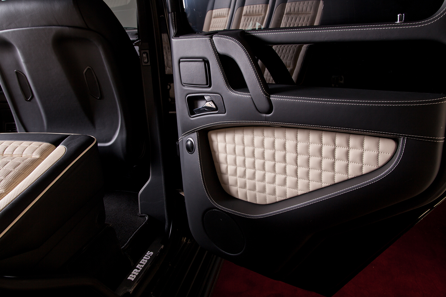 Для автомобиля в аэроките Brabus Widestar мы создали полностью новый дизайн интерьера.Так как автомобиль отличался очень агрессивным внешним видом, то для интерьера выбрали два цвета - чёрный и белый (кремовй). Вставки в сиденьях и дверях сделаны в мелкий квадрат. Верхние вставки в дверях заменены с кожаных на шпонированные. На сиденьях применена перфорированная квадратными отверстиями кожа (как в заводском варианте AMG). Все, даже самые мелкие элементы интерьера, перетянуты гладкой кожей. Стандартное коричневое дерево заменено на чёрный рояльный лак. Добавлен хром-пакет интерьера: рамка ручки АКПП и дверные штифты с окантовками. Руль переделан в анатомический с сохранением функции подогрева. В дополнение установлены внутренние пороги со светящимся логотипом BRABUS и салонные коврики Brabus