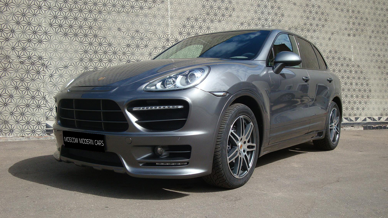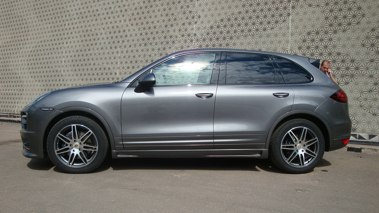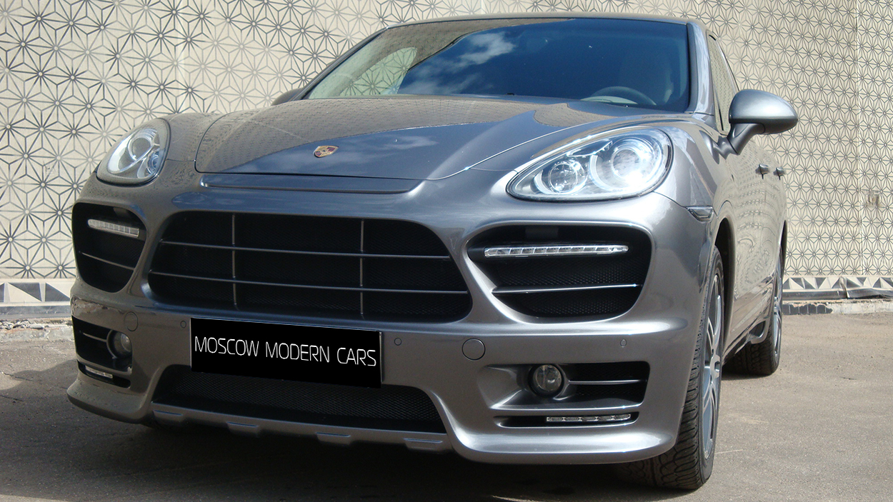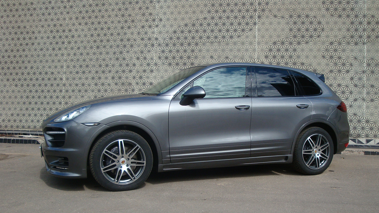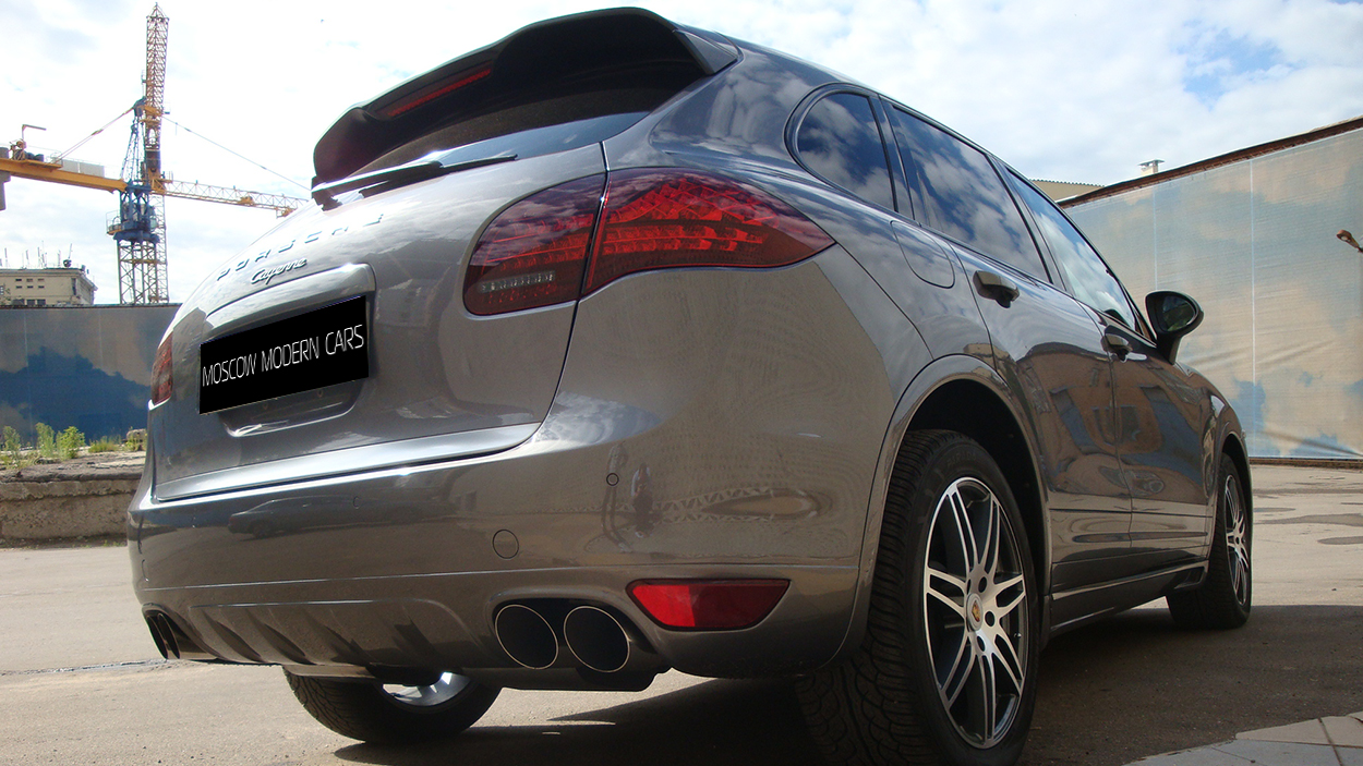 Porsche Cayenne 3.6. На автомобиль установлен аэрокит фирмы Hamann и спортивный глушитель с насадками. Задние американские фонари заменены на оригинальные тонированные с желтым поворотником.Все неокрашенные части заводского пластика по нижнему периметру автомобиля покрашены в цвет кузова.