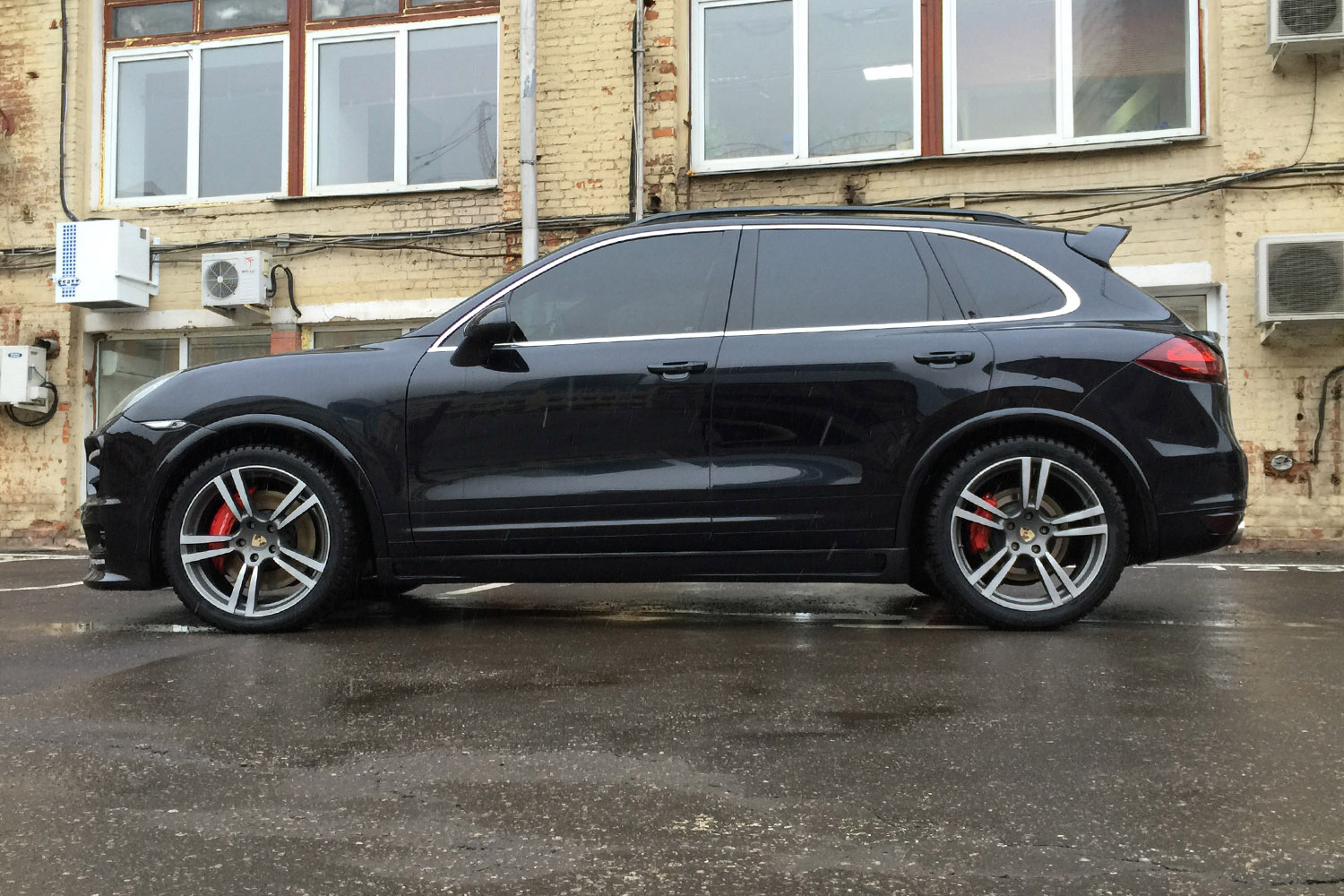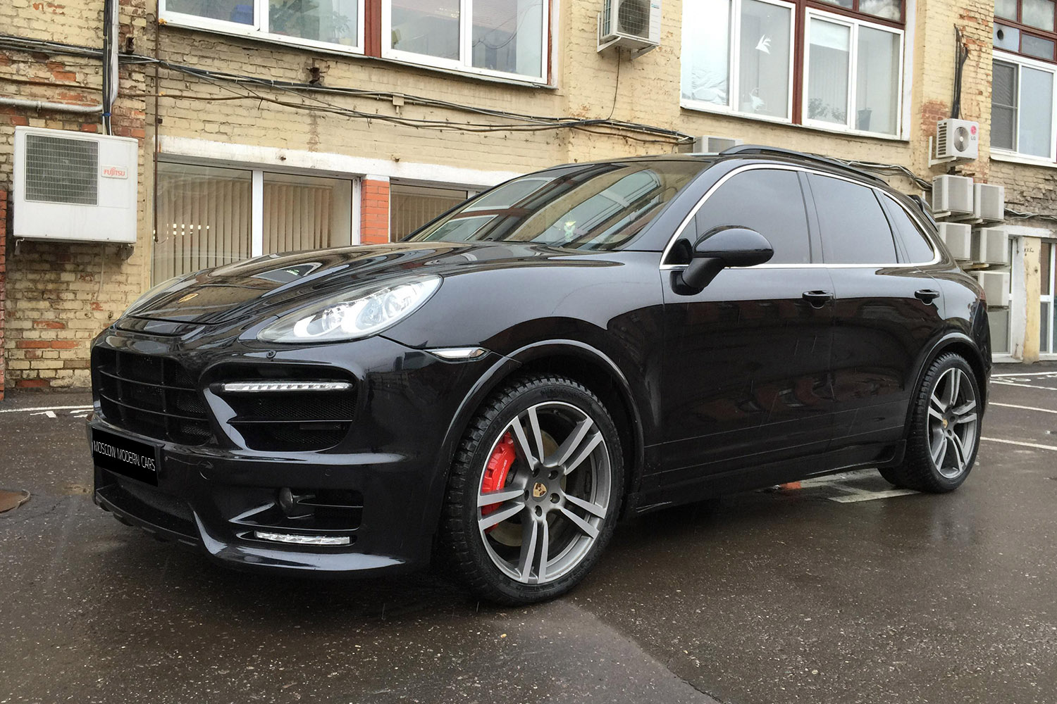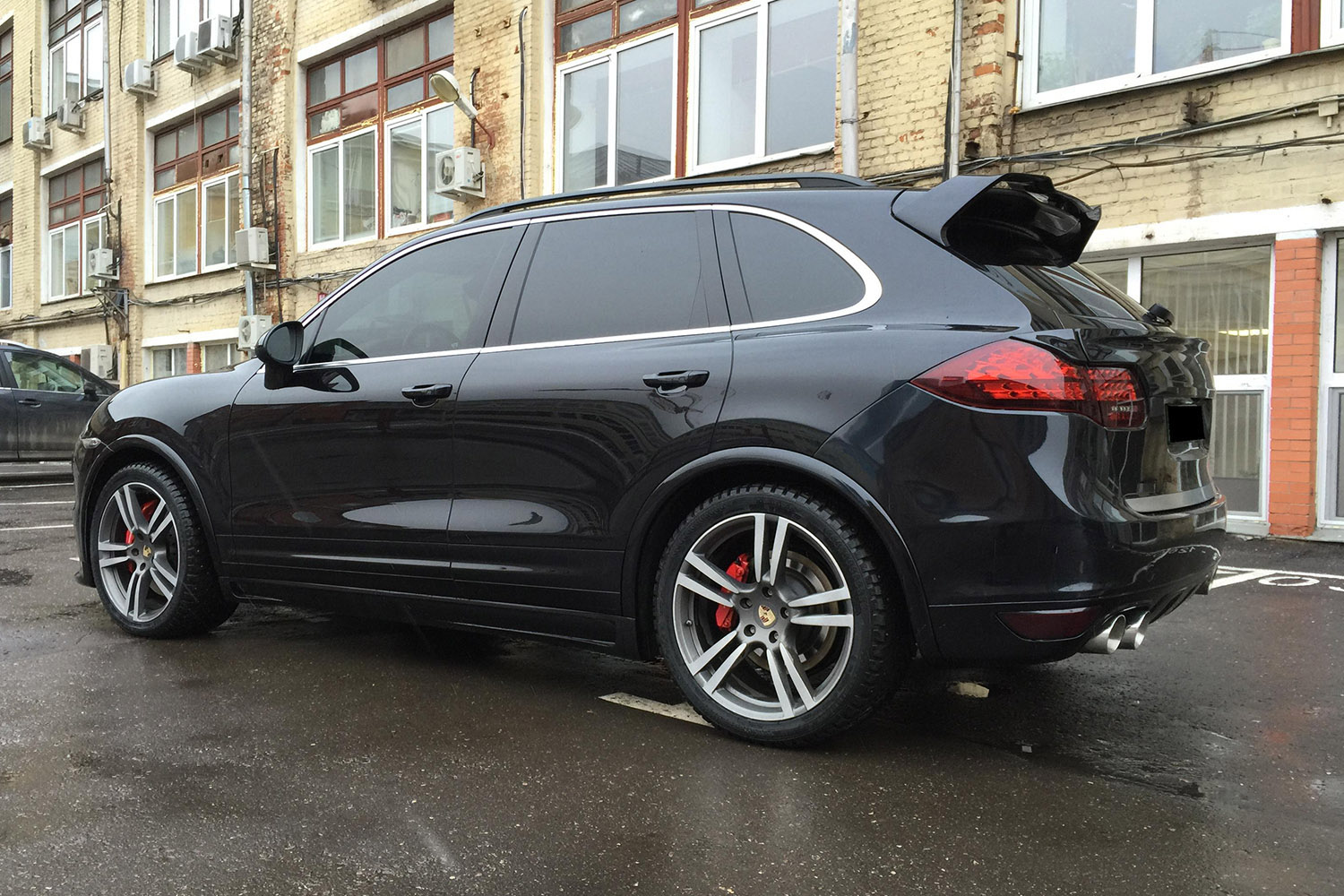 Porsche Cayenne Turbo. На автомобиль установлен аэрокит фирмы Hamann, насадки на глушитель и спойлера на крышку багажника. Задние американские фонари заменены на оригинальные тонированные с желтым поворотником.Все неокрашенные части заводского пластика по нижнему периметру автомобиля покрашены в цвет кузова.