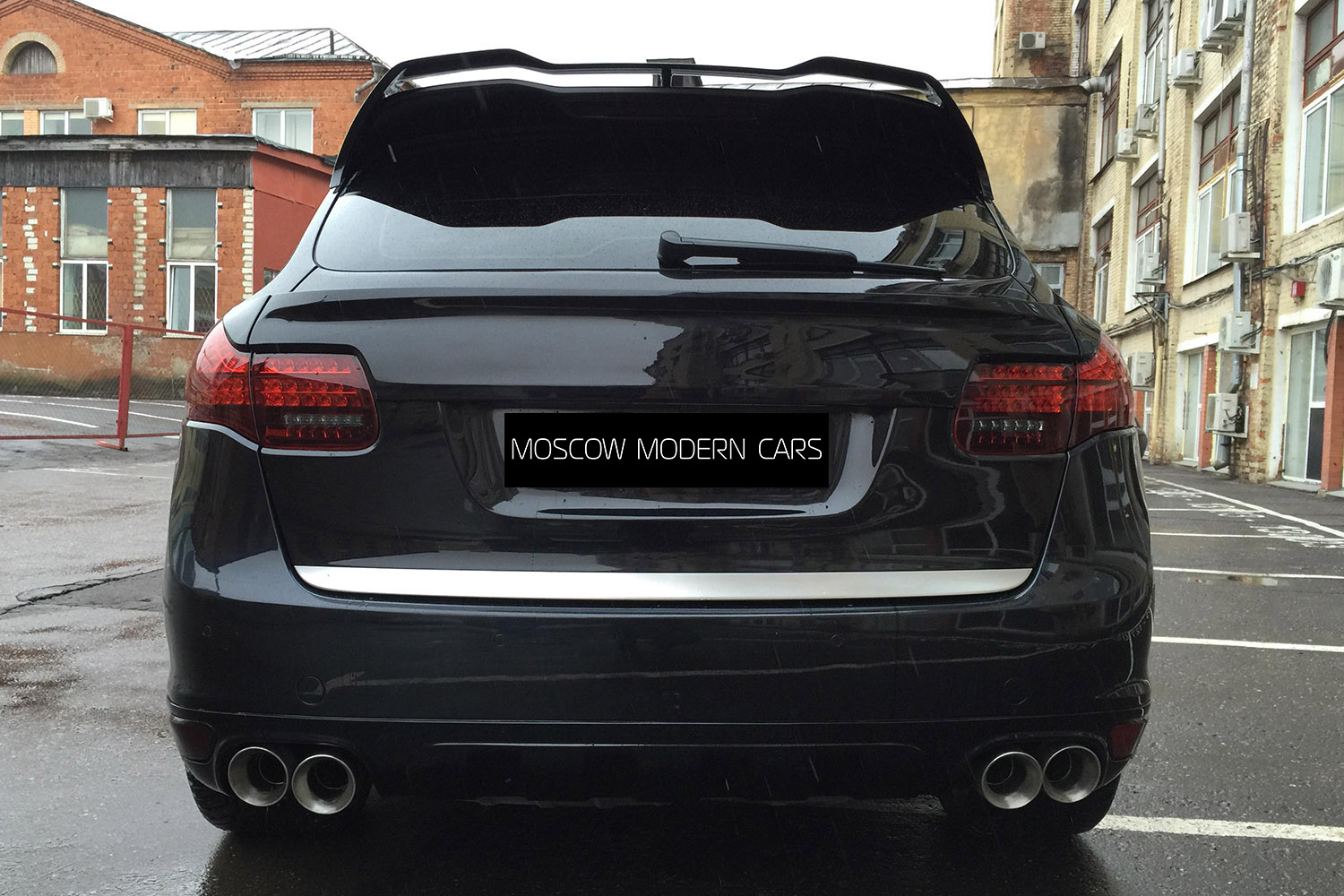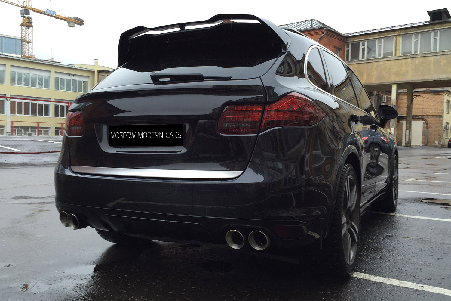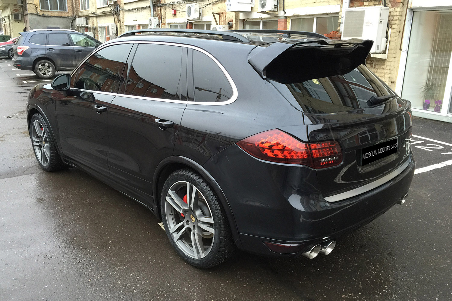 Porsche Cayenne Turbo. На автомобиль установлен аэрокит фирмы Hamann, насадки на глушитель и спойлера на крышку багажника. Задние американские фонари заменены на оригинальные тонированные с желтым поворотником.Все неокрашенные части заводского пластика по нижнему периметру автомобиля покрашены в цвет кузова.