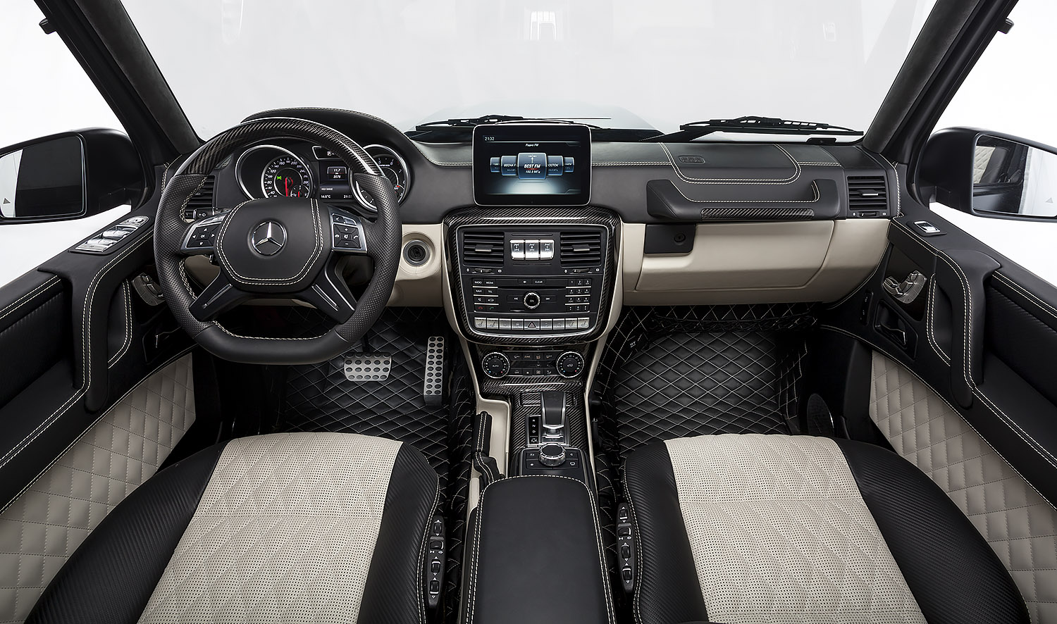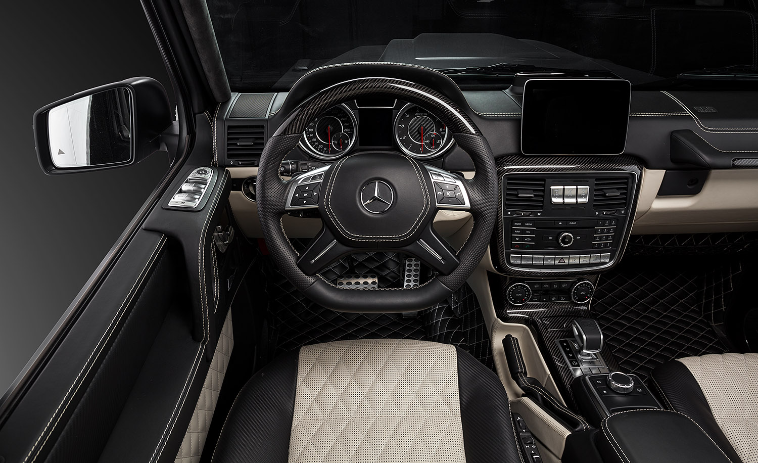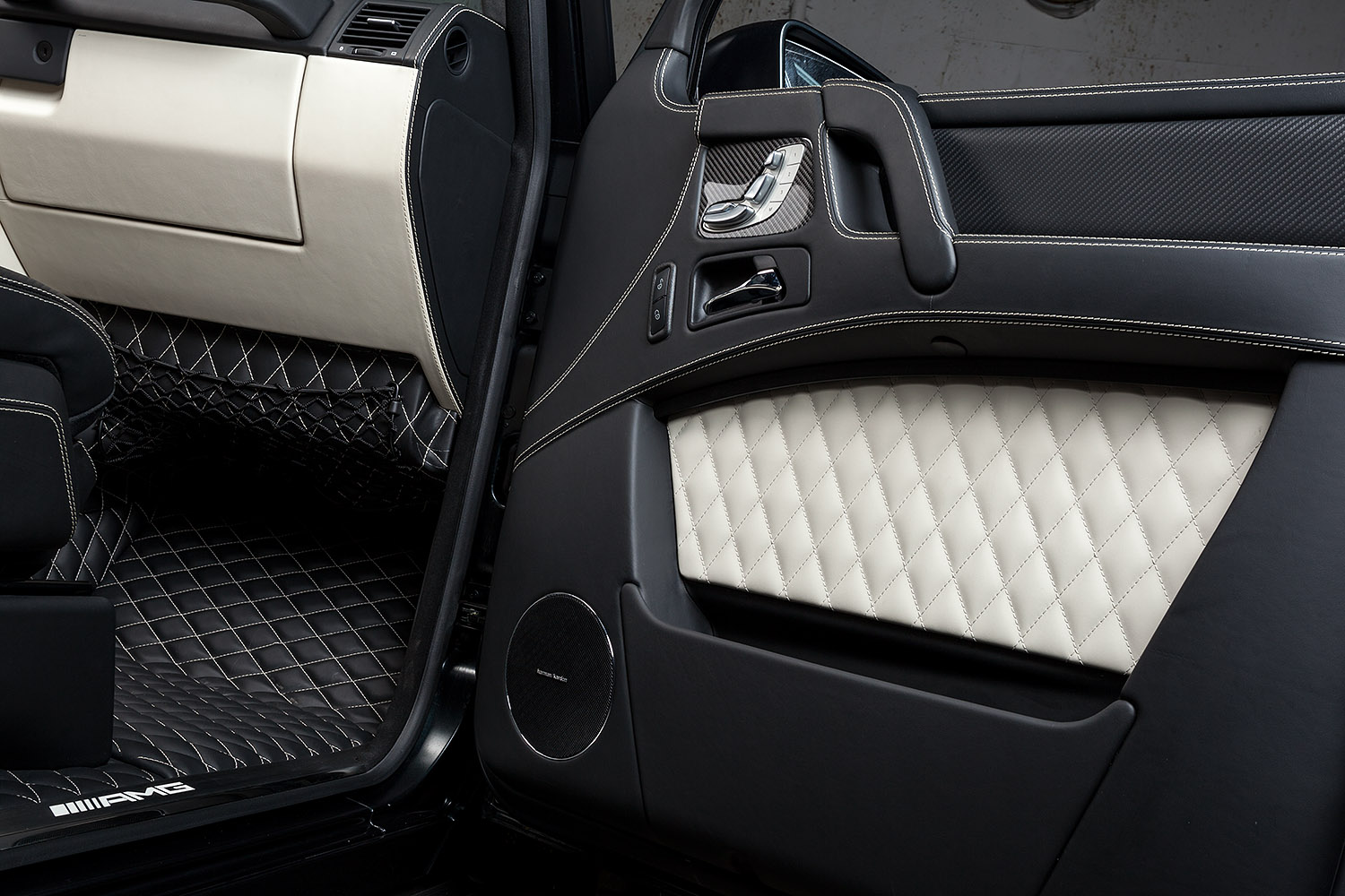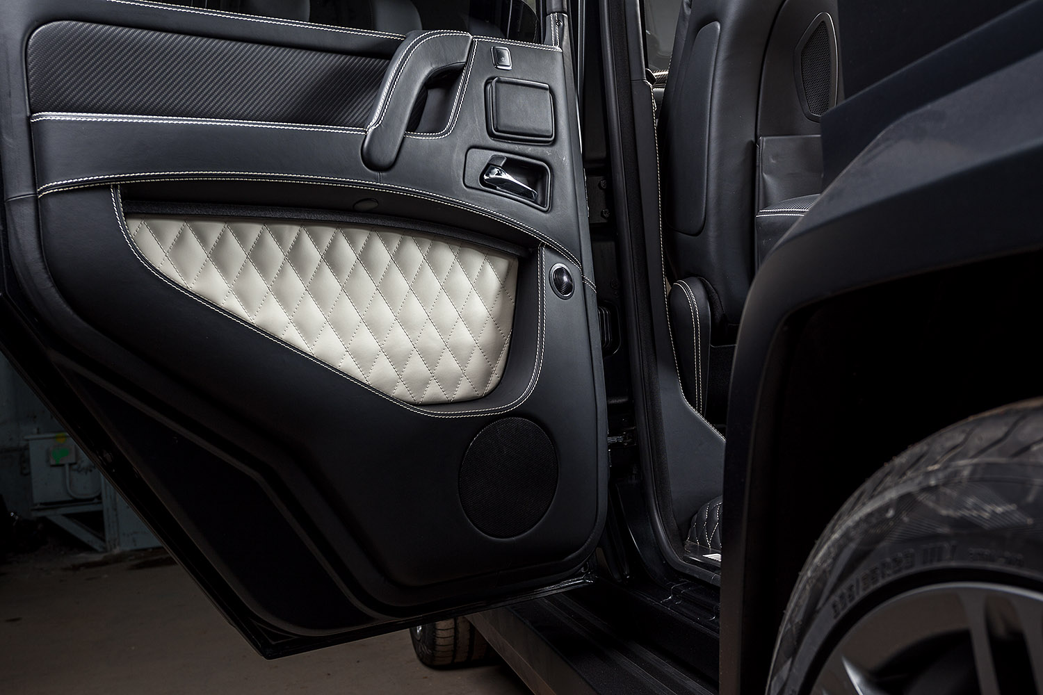 Интерьер этого автомобиля, перешитый в нашем ателье, выполнен в оригинальном дизайне версии Edition 463. Чтобы достичь этого результата, мы полностью перешили все элементы салона кожей "наппа" в комбинации чёрного и белого цветов, при этом, отдельные элементы, вставки в дверях, боковины сидений, отделаны кожей "под карбон", чтобы соответствовать заводскому эталону. Потолок перетянут алькантарой цвета "антрацит", а солнцезащитные козырьки и потолочные ручки затянуты чёрной "наппой". Светло-серые плафоны и фурнитура перекрашены в чёрный цвет, с сохранением светящихся пиктограмм на кнопках. Деревянные панели в отделке салона заменены на карбоновые. Стандартный руль мы переделали в вариант Perfomance, но с карбоновой отделкой и сохранением подогрева, а щиток приборов и ручку селектора АКПП заменили на версию от G63 AMG. Всё стандартное ковровое покрытие пола заменено на гладкую кожу, прошитую "ромбом". Еще, из нестандартных работ, можем отметить замену кнопок стеклоподъёмников и джойстиков управления передних сидений на вариант от S-class W222. Багажник этого автомобиля также полностью отделан кожей. В задней части салона установлены мониторы развлекательной системы для пассажиров. Также установлены пороги со светящимся логотипом AMG на всех дверях, включая багажную. Результат нашей работы можно увидеть на фото.