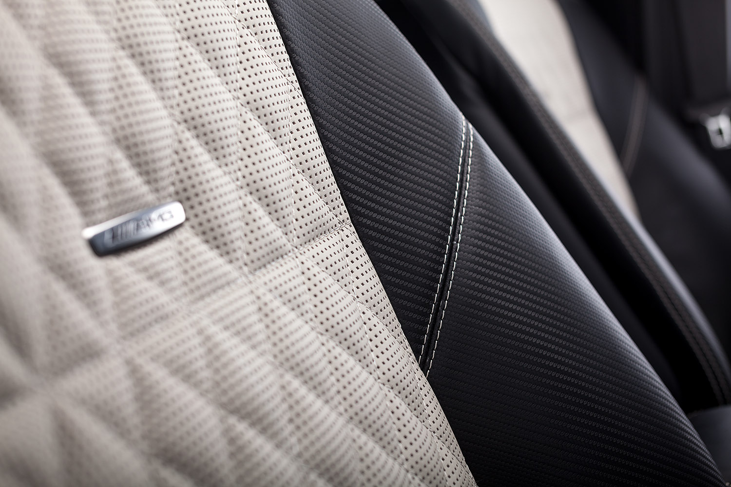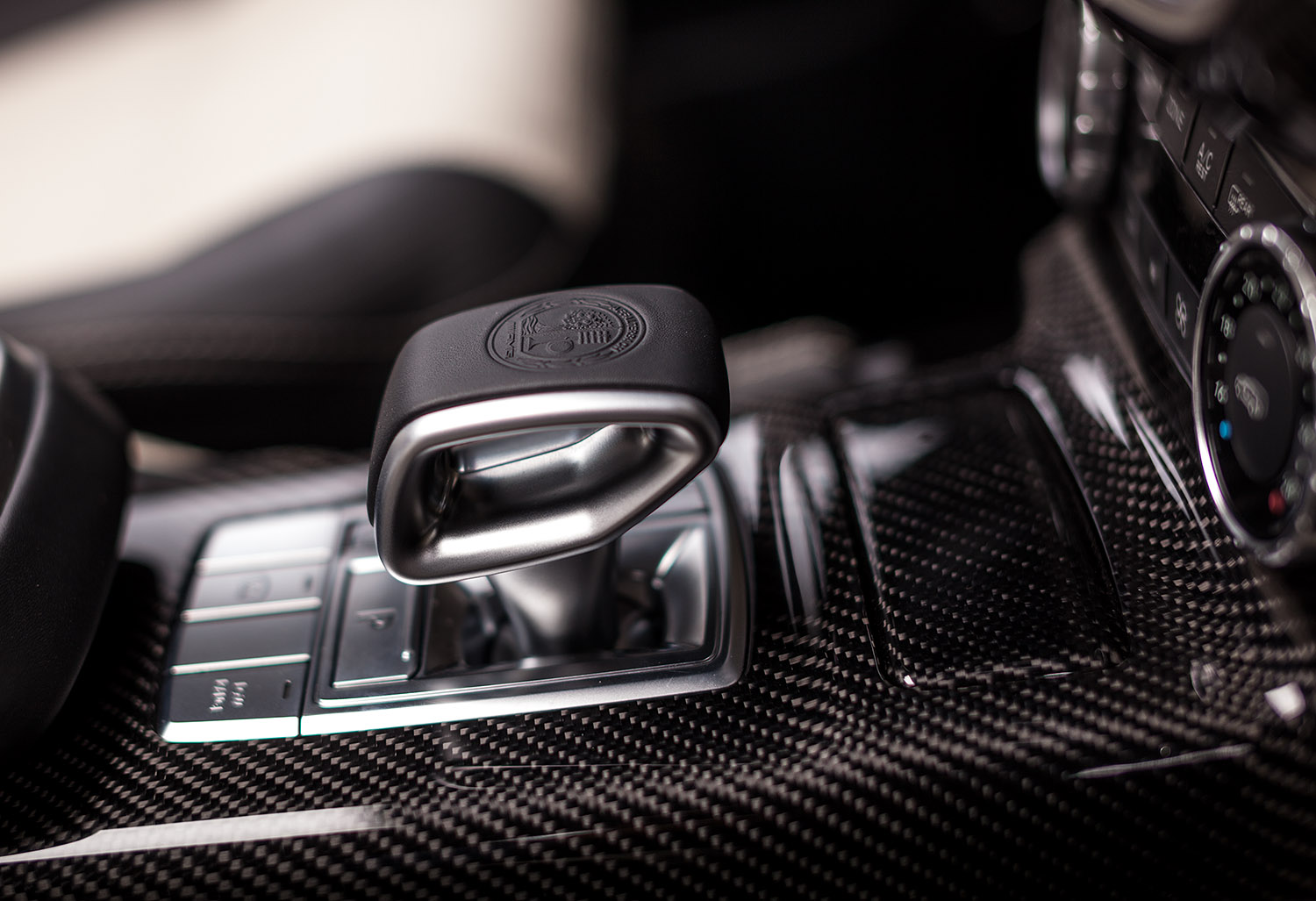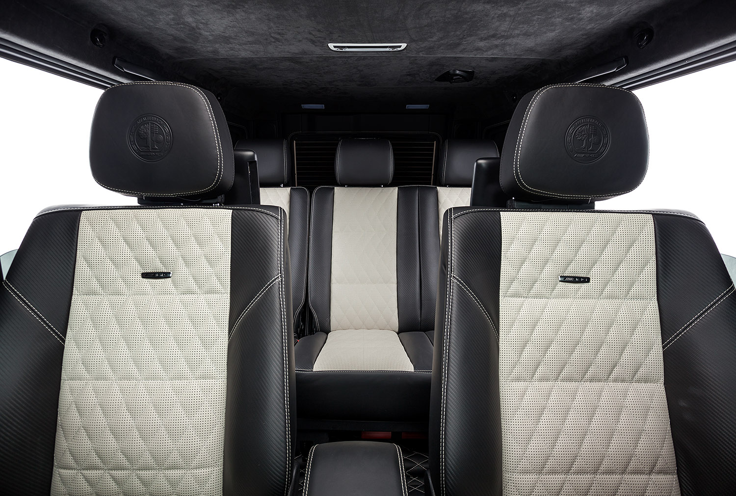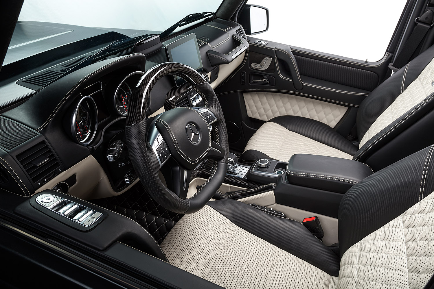 Интерьер этого автомобиля, перешитый в нашем ателье, выполнен в оригинальном дизайне версии Edition 463. Чтобы достичь этого результата, мы полностью перешили все элементы салона кожей "наппа" в комбинации чёрного и белого цветов, при этом, отдельные элементы, вставки в дверях, боковины сидений, отделаны кожей "под карбон", чтобы соответствовать заводскому эталону. Потолок перетянут алькантарой цвета "антрацит", а солнцезащитные козырьки и потолочные ручки затянуты чёрной "наппой". Светло-серые плафоны и фурнитура перекрашены в чёрный цвет, с сохранением светящихся пиктограмм на кнопках. Деревянные панели в отделке салона заменены на карбоновые. Стандартный руль мы переделали в вариант Perfomance, но с карбоновой отделкой и сохранением подогрева, а щиток приборов и ручку селектора АКПП заменили на версию от G63 AMG. Всё стандартное ковровое покрытие пола заменено на гладкую кожу, прошитую "ромбом". Еще, из нестандартных работ, можем отметить замену кнопок стеклоподъёмников и джойстиков управления передних сидений на вариант от S-class W222. Багажник этого автомобиля также полностью отделан кожей. В задней части салона установлены мониторы развлекательной системы для пассажиров. Также установлены пороги со светящимся логотипом AMG на всех дверях, включая багажную. Результат нашей работы можно увидеть на фото.