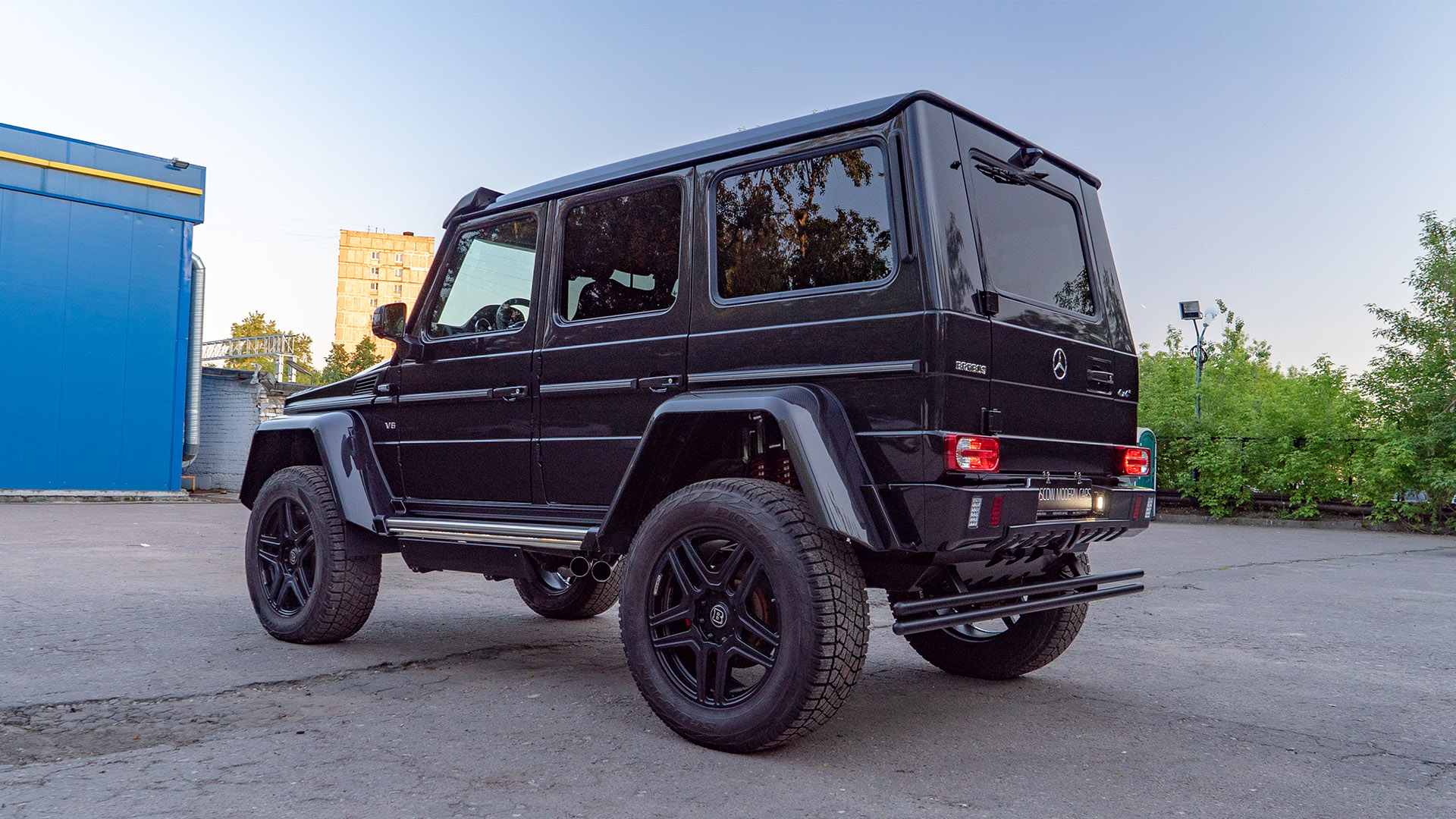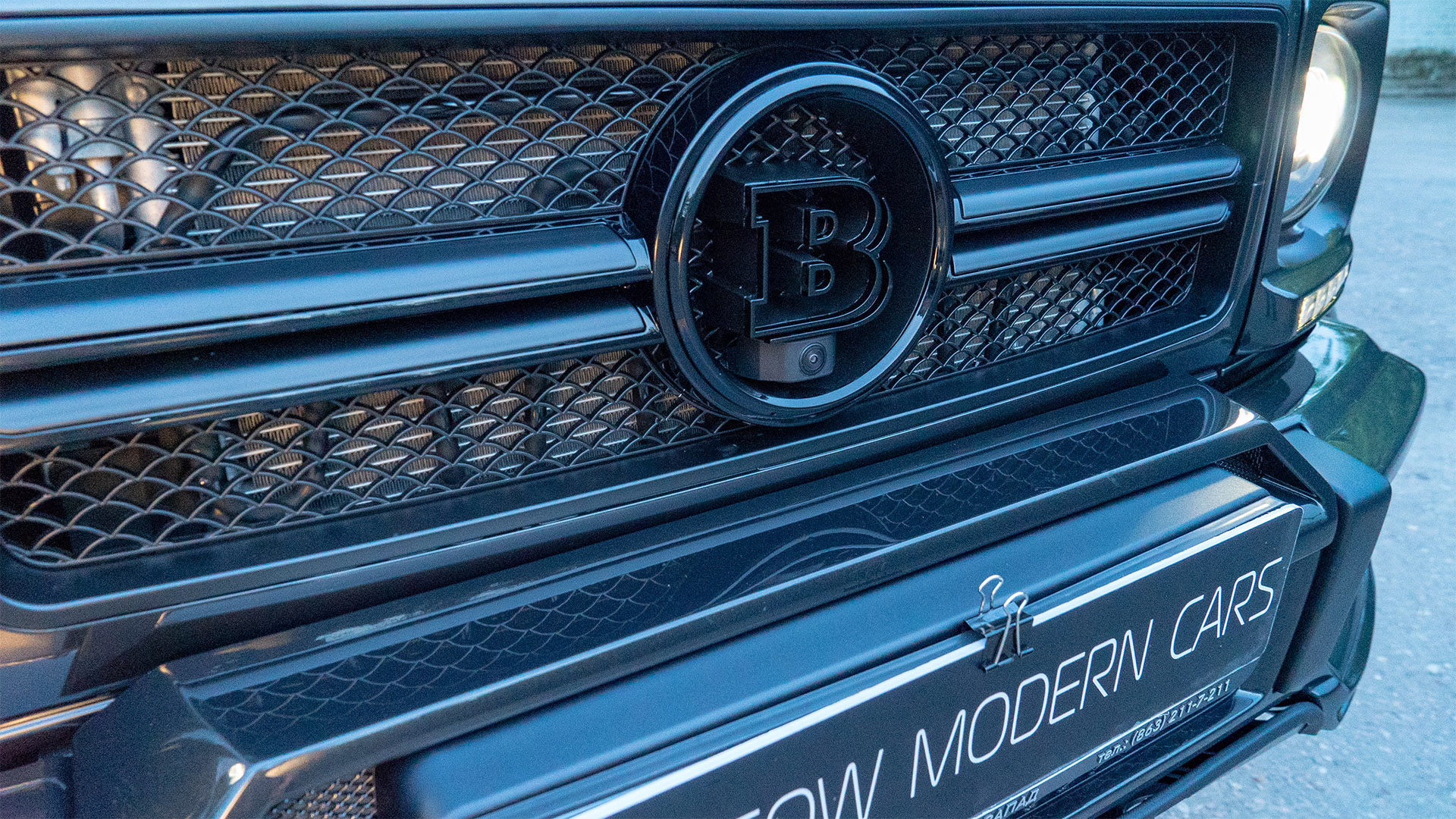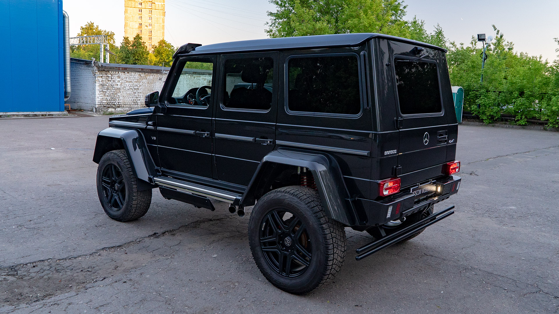 Основной целью преобразования внешности этой машины было получить более напористый и злой образ от Brabus. Помимо внешних переделок, на автомобиль установлен мощностной кит от Brabus поднявший мощность мотора до 500 л.с. Моторный отсек также доработан по стилю Brabus. Power-kit дополняет выхлопная система Brabus с переключением громкости звука. Для удобства входа-выхода мы установили электрические подножки Brabus. В салоне также установлены приятные аксессуары в виде доработанного щитка приборов, светящихся порогов, накладок на педали и ручки АКПП. Так как модель 4Х4 не оснащается парковочными радарами, было принято решение оснастить машину камерами кругового обзора для удобства при маневрировании на парковках. Штатные диски мы окрасили в чёрный матовый цвет и вставили в них колпаки Brabus. Карбоновые аксессуары снаружи машины также привлекают внимание.