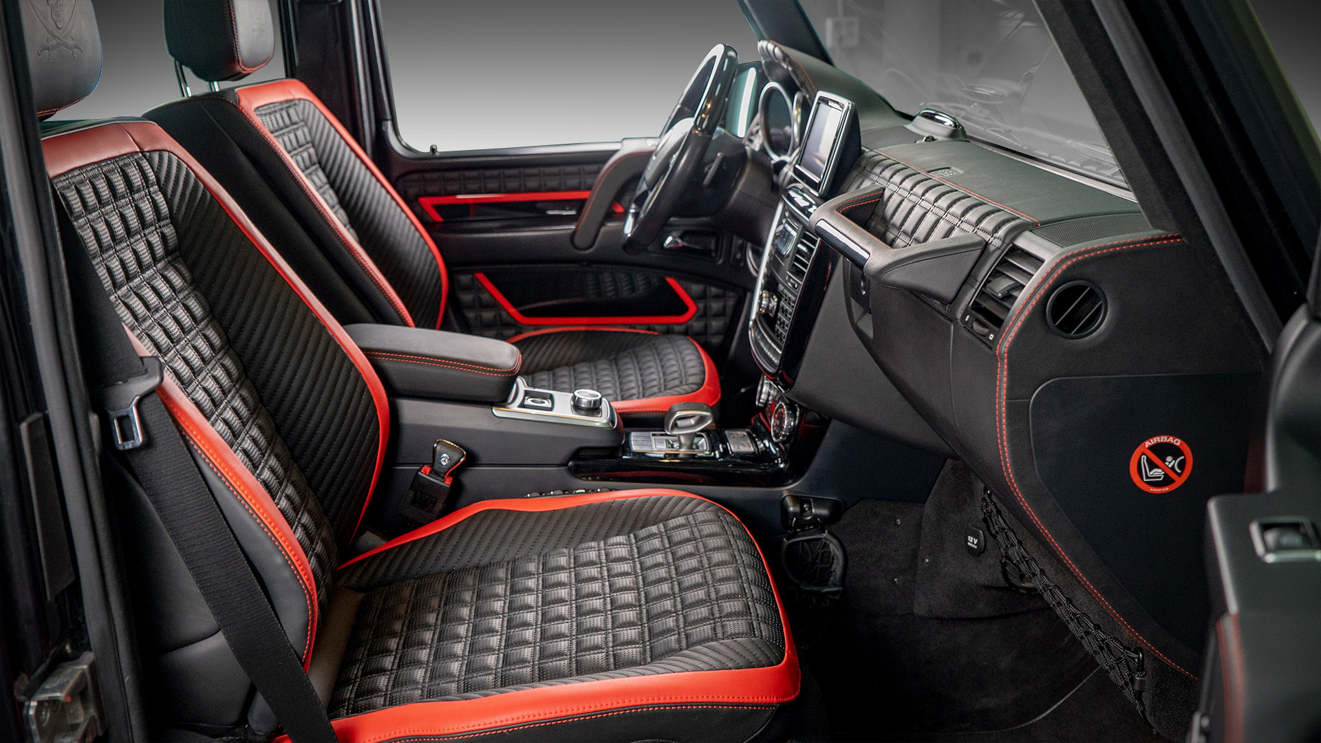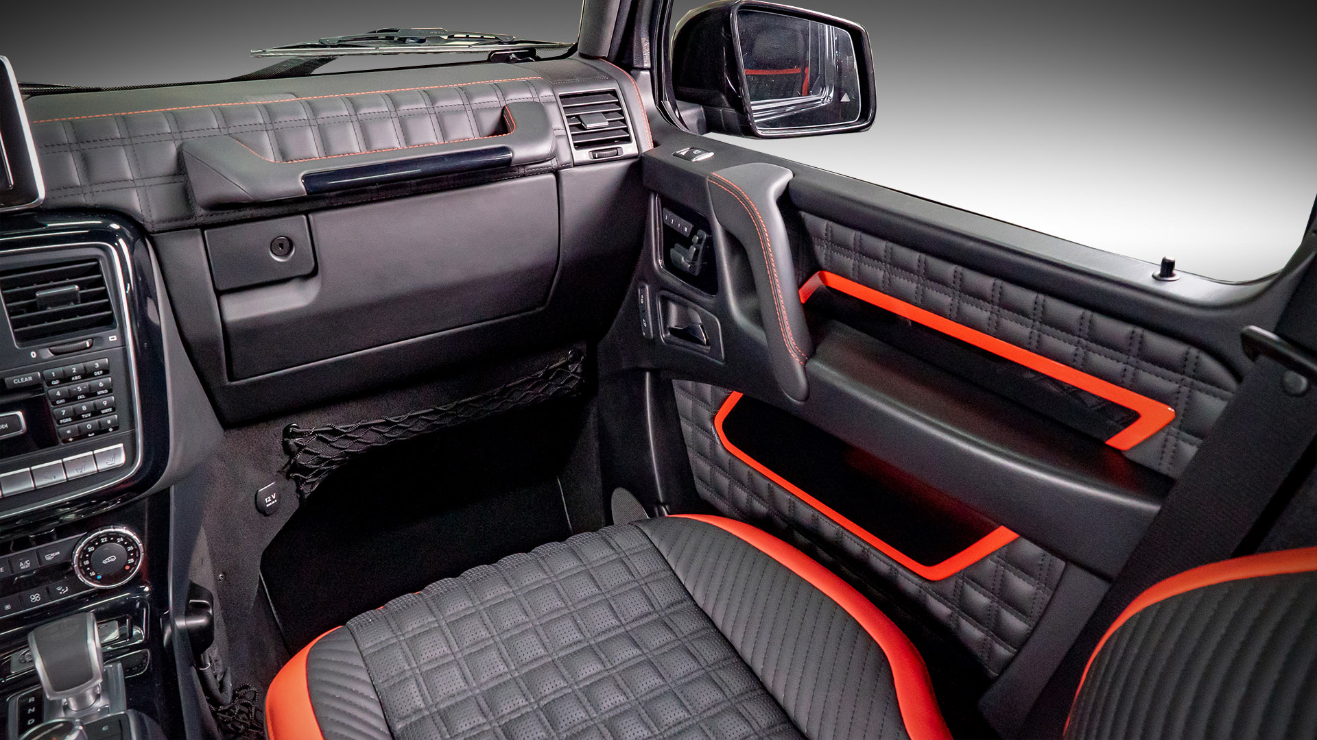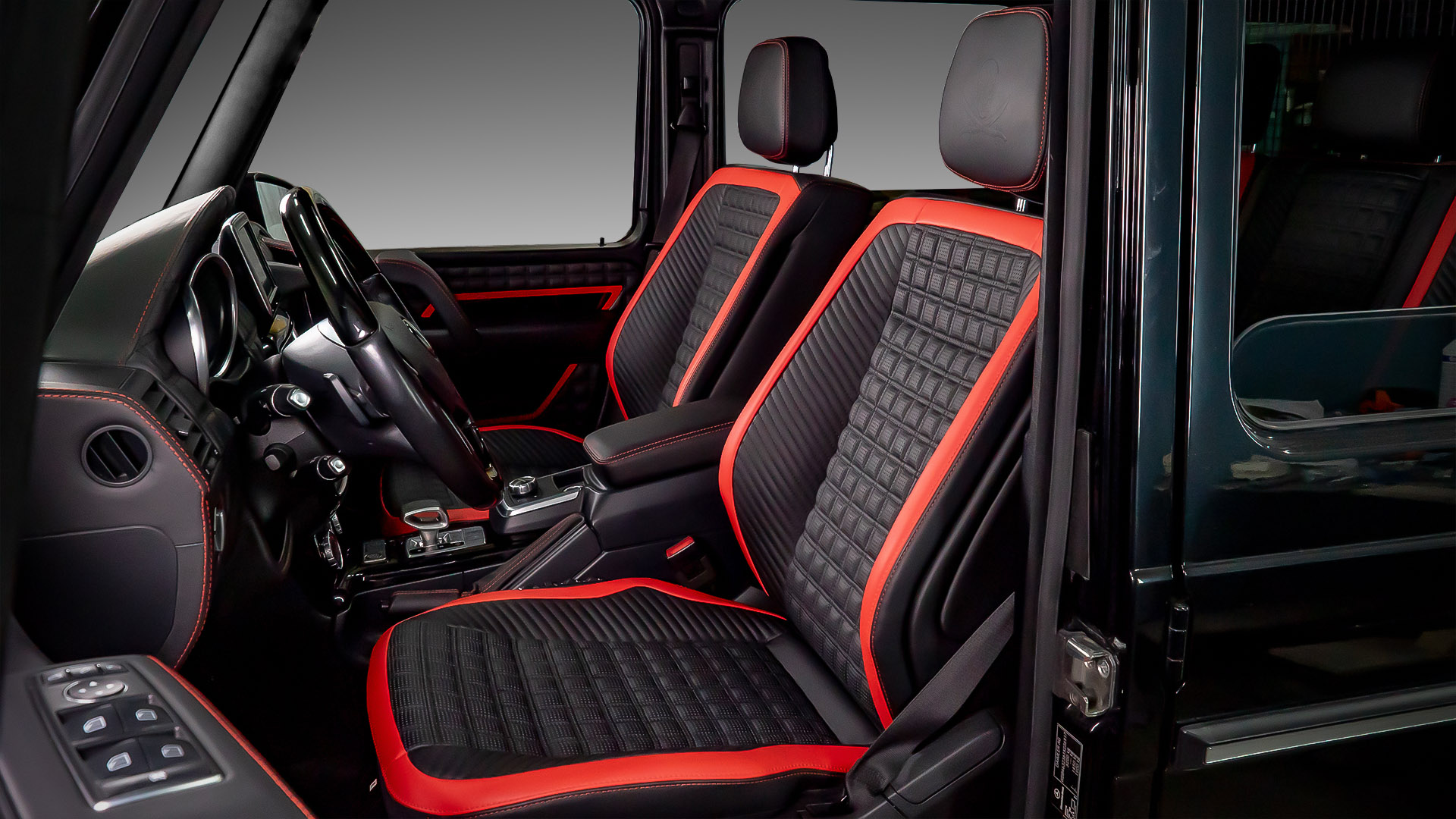 Ещё одна вариация нашего любимого красно-чёрного салона. В этой машине мы не стали полностью обшивать кожей обивки дверей и пластиковые панели салона, а сосредоточились на придании броского внешнего вида интерьеру. Для этого мы применили черные глянцевые вставки с красным кантом в дверных обшивках. Дизайн этих вставок перекликается с дизайном сидений. Также мы переделали штатный щиток приборов в AMG-версию и замени ручку АКПП. Завершает картину наш логотип выдавленный на подголовниках передних кресел.