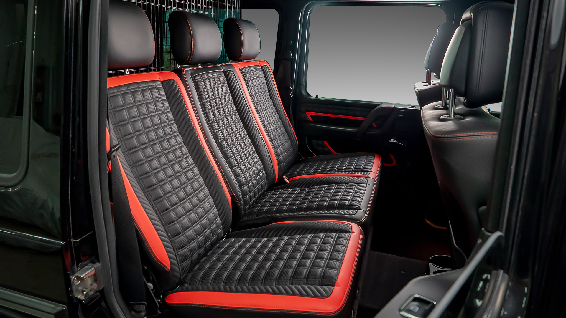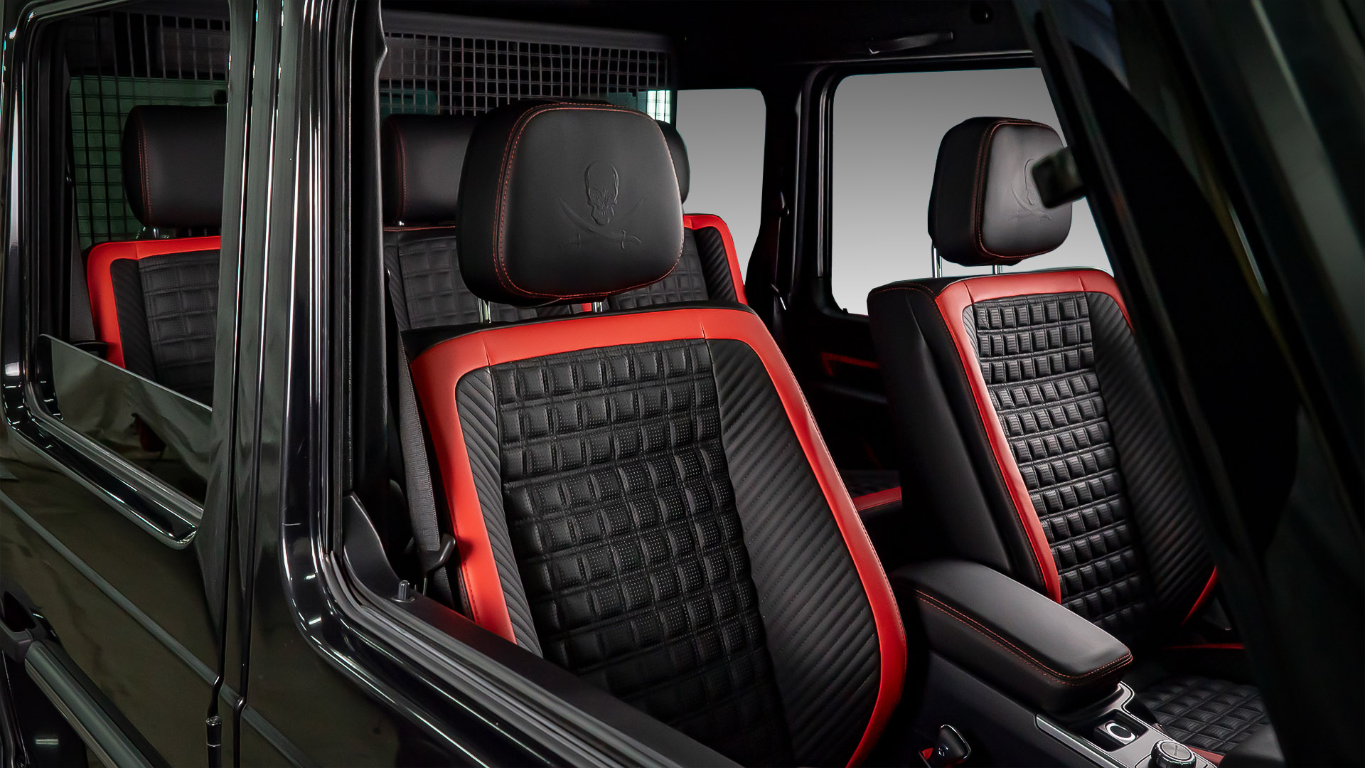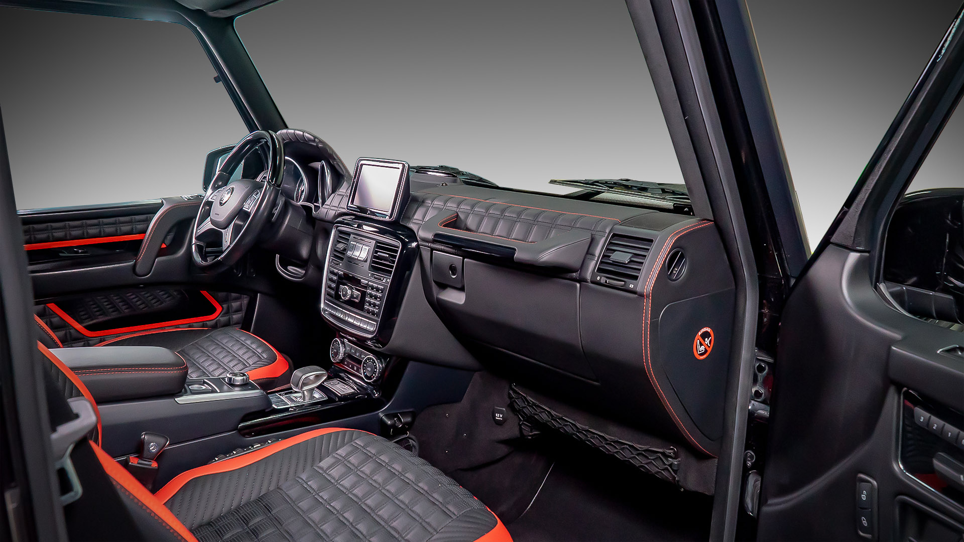 Ещё одна вариация нашего любимого красно-чёрного салона. В этой машине мы не стали полностью обшивать кожей обивки дверей и пластиковые панели салона, а сосредоточились на придании броского внешнего вида интерьеру. Для этого мы применили черные глянцевые вставки с красным кантом в дверных обшивках. Дизайн этих вставок перекликается с дизайном сидений. Также мы переделали штатный щиток приборов в AMG-версию и замени ручку АКПП. Завершает картину наш логотип выдавленный на подголовниках передних кресел.