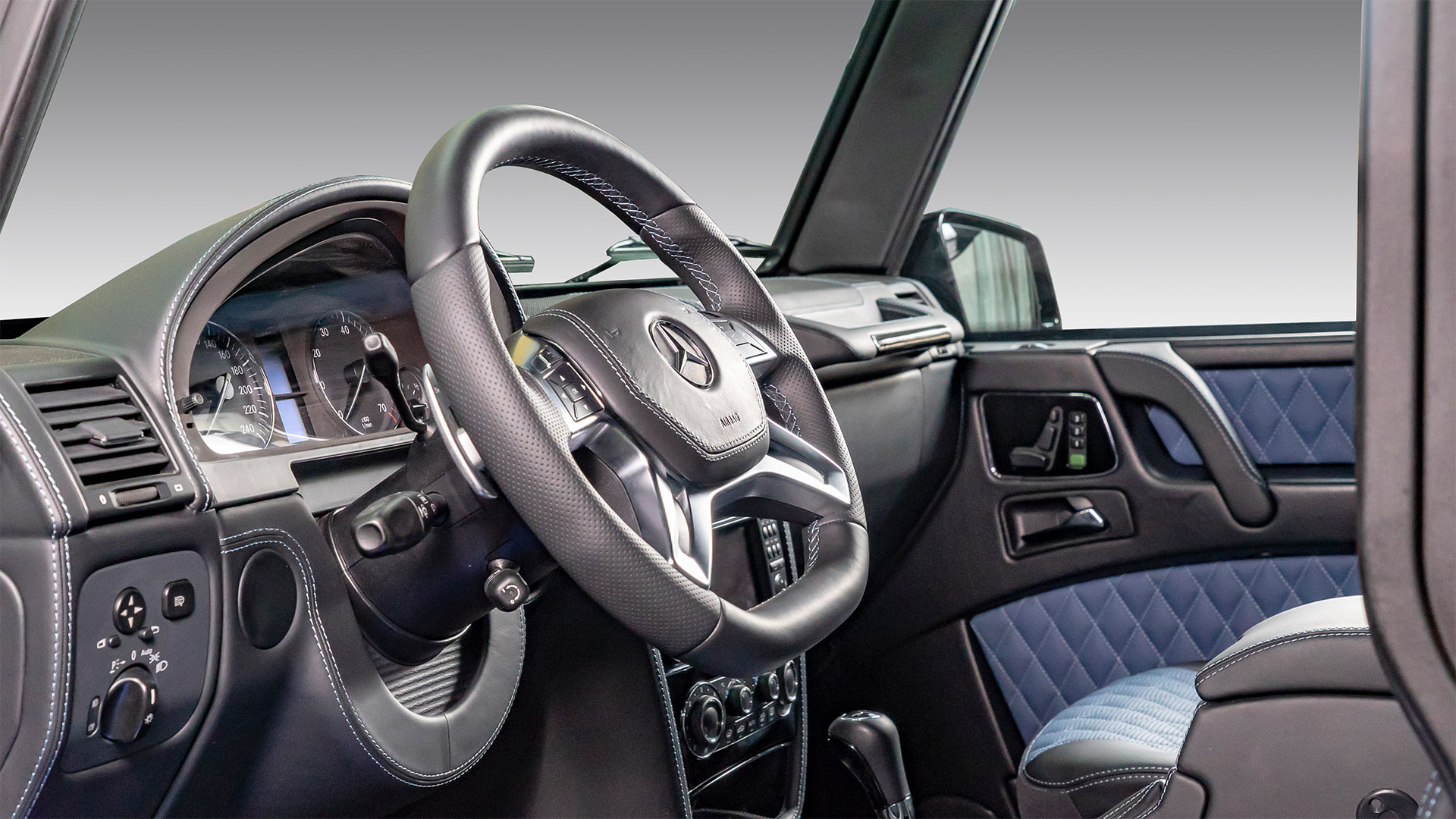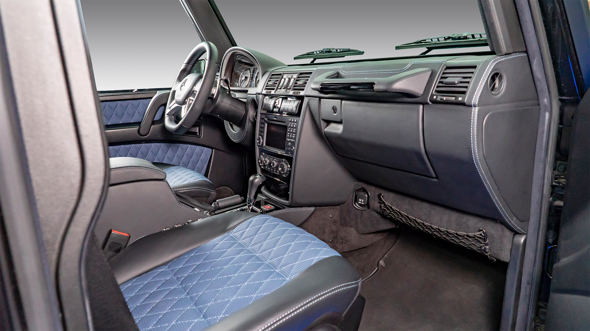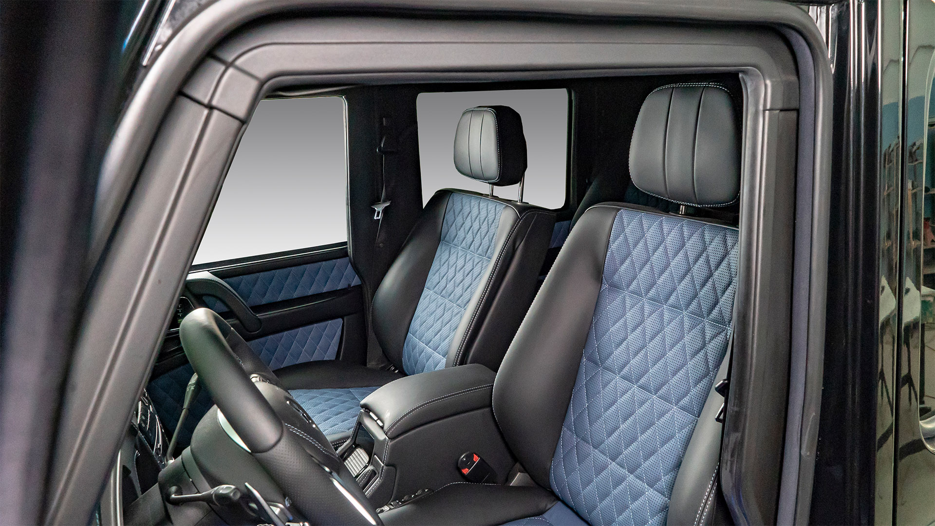 Салон этого дорестайлингового автомобиля было решено перешить в вариант AMG Exclusive, как у модели G63 AMG. Выбор цвета пал на "яхтенный синий" из цветовой гаммы нового G463 2018 года. В салоне перешиты гладкой кожей "наппа": торпедо, центральная консоль с подлокотником, передние и задние раздельные сиденья, вставки и ручки в дверях и подлокотник на задней консоли. Стандартный руль мы заменили на вариант Perfomace от G63, причем оснастили его функцией подогрева. Коричневое дерево в салоне мы перекрасили в чёрный глянец.
