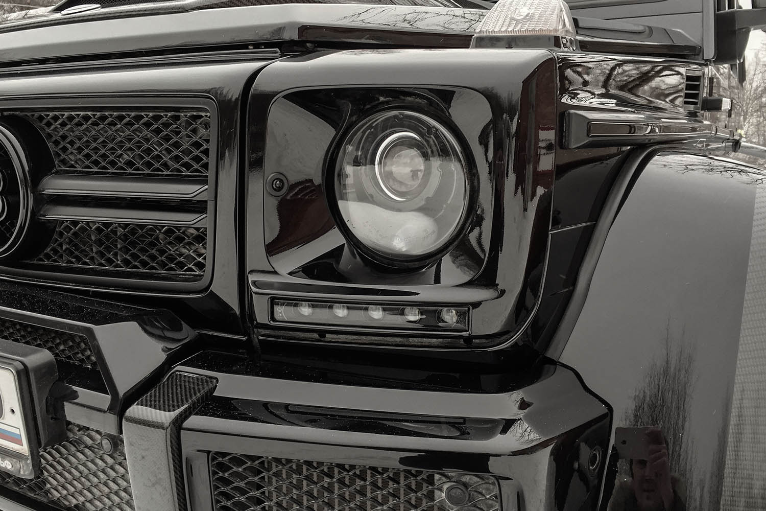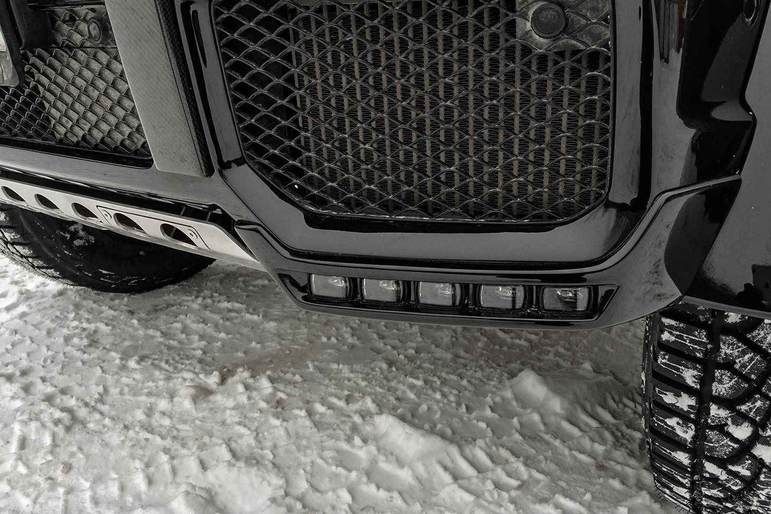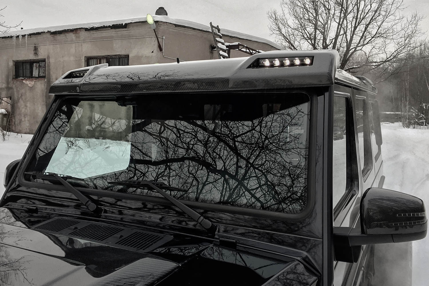 - карбоновый козырек от модели G63 AMG 6X6 с чёрными ходовыми огнями