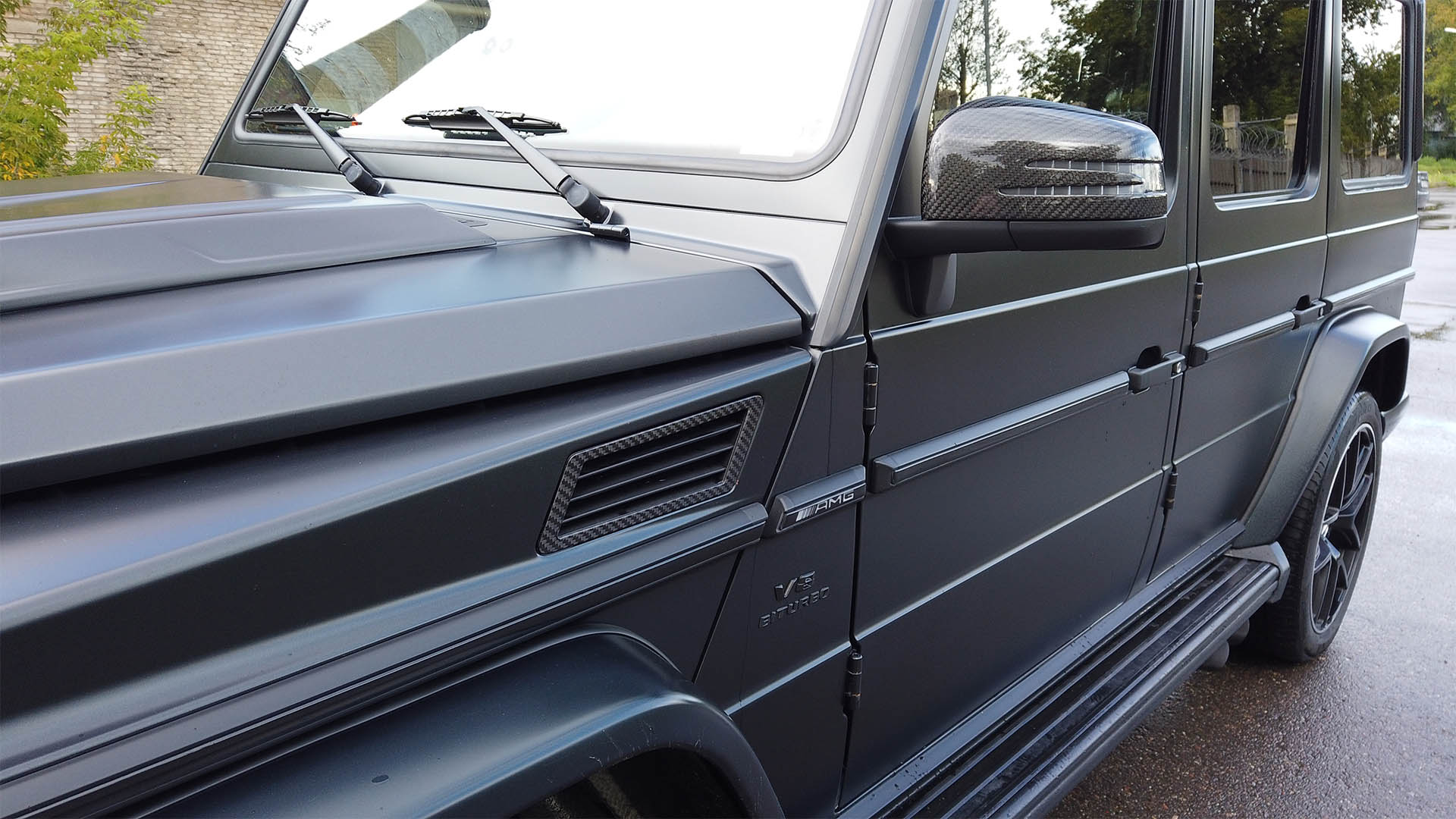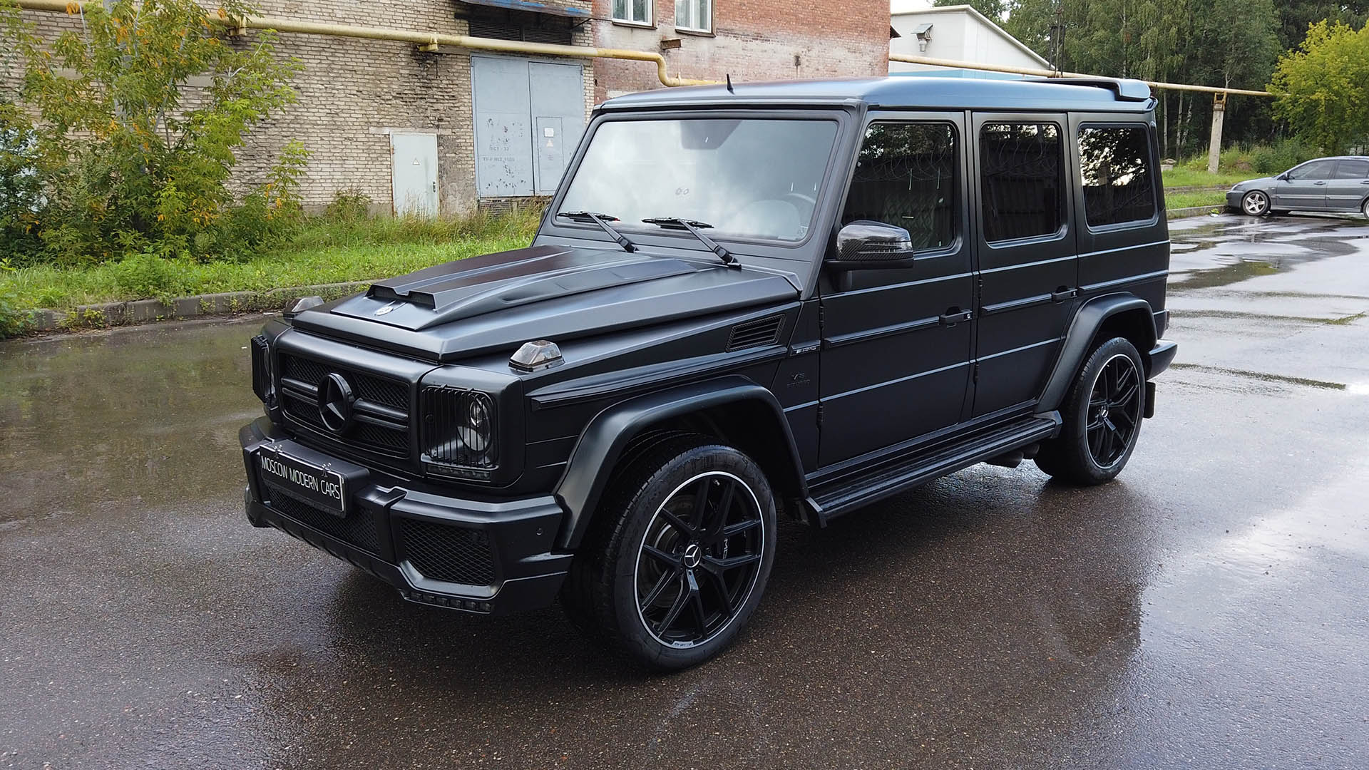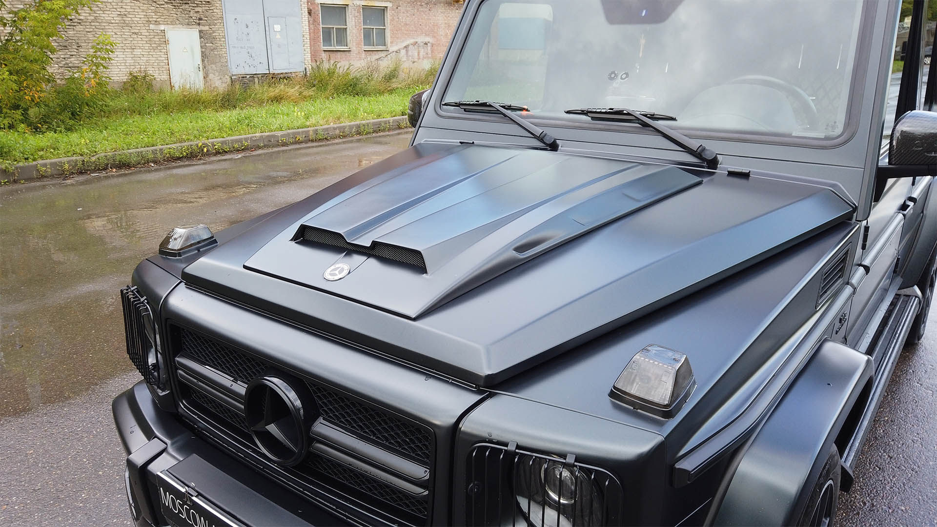 Этот автомобиль приехал к нам освежить внешность после продолжительной эксплуатации. Так как ничего глобального владельцу затевать не хотелось, то выбор остановился на трёх элементах от стиля Brabus и удалении всего хрома с автомобиля. В чёрный цвет на этой машине покрашено всё: и решётка радиатора, и клыки на бампер, и подножки, и отражатели фар, и обод запаски, и даже суппорта тормозной системы. На передний бампер установлена юбка с ходовыми огнями в стиле Brabus, на капоте стоит накладка в новом стиле 2019 года, а на крыше установлен спойлер, также в стиле Brabus. Стандартные ходовые огни в масках фар заменены на чёрные от Brabus с перекодировкой штатной электроники на предмет ошибок. Насадки глушителя окрашены в чёрный цвет термостойкой краской, на колесные болты мы установили декоративные чёрные, пластиковые колпачки. Передняя и вся задняя оптика дополнительно затонирована, а на зеркала, воздухозаборники в крыльях и задние дефлектора установлены карбоновые накладки. Серебристый молдинг-вставка AMG заменен на чёрный вариант от версии Edition. Все логотипы также заменены на чёрные.