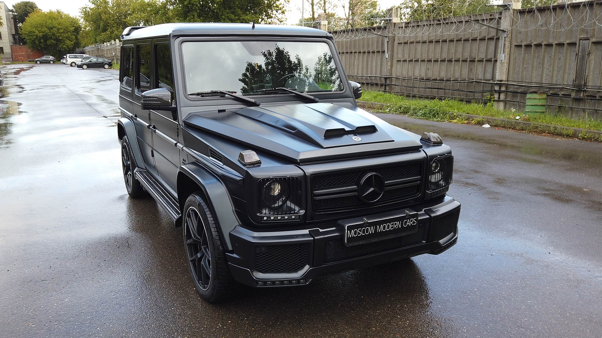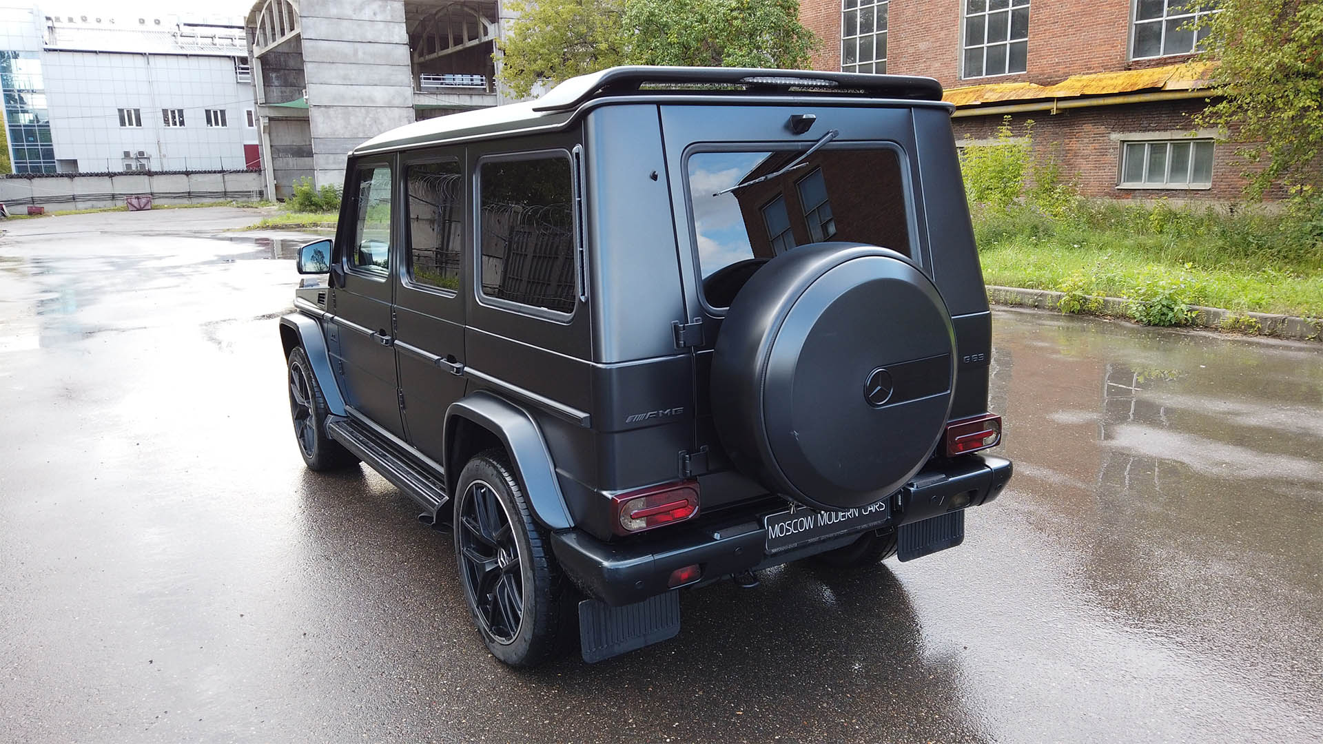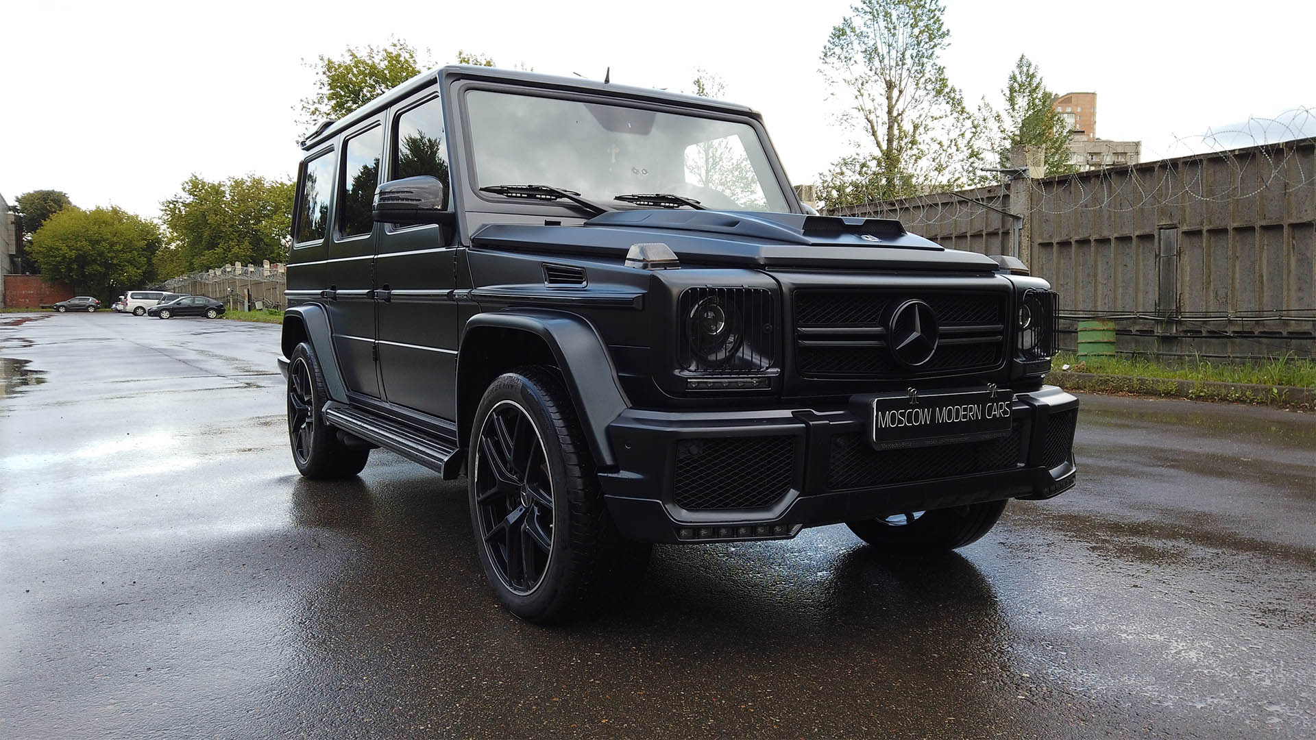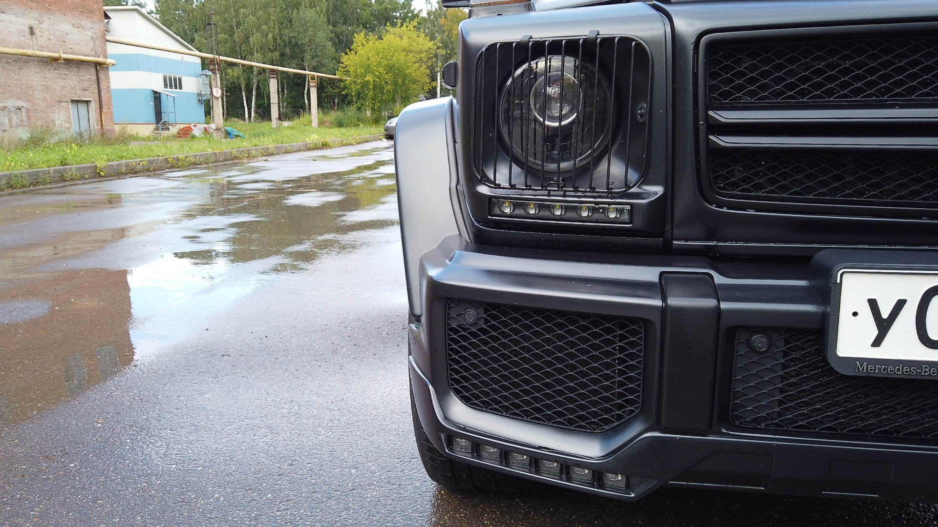 Этот автомобиль приехал к нам освежить внешность после продолжительной эксплуатации. Так как ничего глобального владельцу затевать не хотелось, то выбор остановился на трёх элементах от стиля Brabus и удалении всего хрома с автомобиля. В чёрный цвет на этой машине покрашено всё: и решётка радиатора, и клыки на бампер, и подножки, и отражатели фар, и обод запаски, и даже суппорта тормозной системы. На передний бампер установлена юбка с ходовыми огнями в стиле Brabus, на капоте стоит накладка в новом стиле 2019 года, а на крыше установлен спойлер, также в стиле Brabus. Стандартные ходовые огни в масках фар заменены на чёрные от Brabus с перекодировкой штатной электроники на предмет ошибок. Насадки глушителя окрашены в чёрный цвет термостойкой краской, на колесные болты мы установили декоративные чёрные, пластиковые колпачки. Передняя и вся задняя оптика дополнительно затонирована, а на зеркала, воздухозаборники в крыльях и задние дефлектора установлены карбоновые накладки. Серебристый молдинг-вставка AMG заменен на чёрный вариант от версии Edition. Все логотипы также заменены на чёрные.