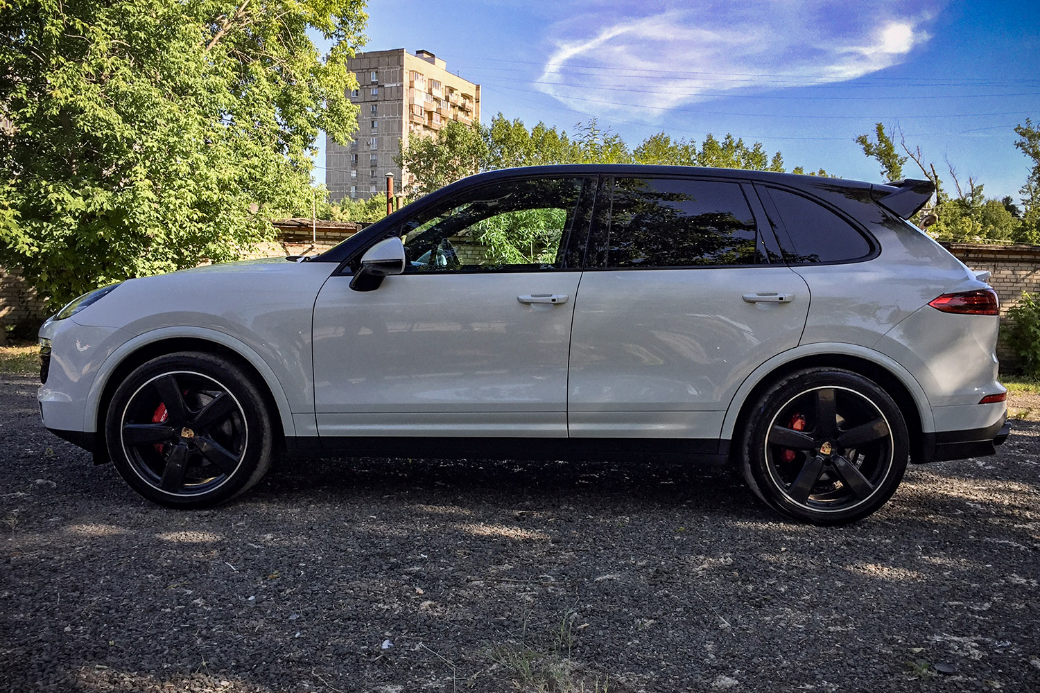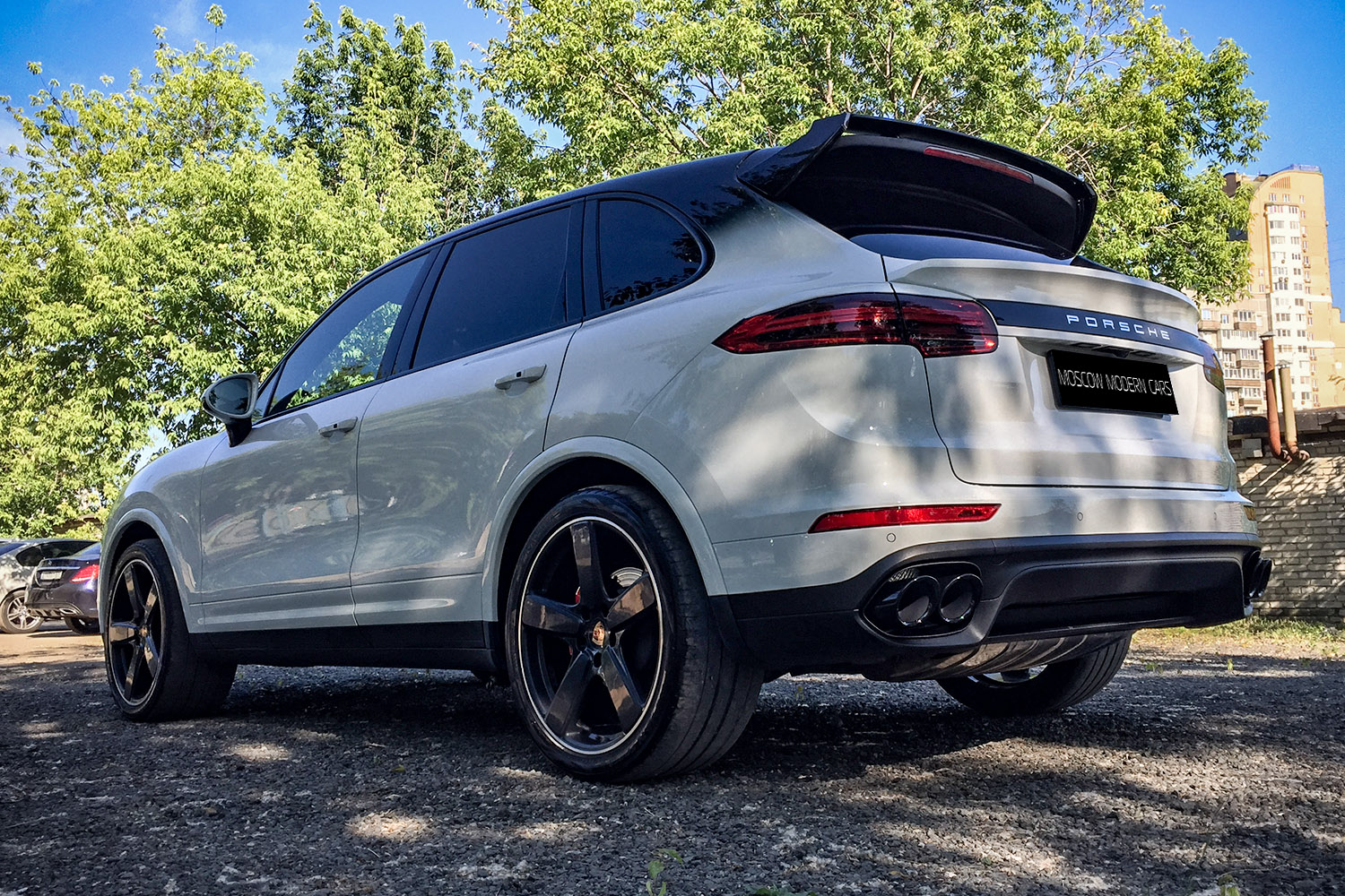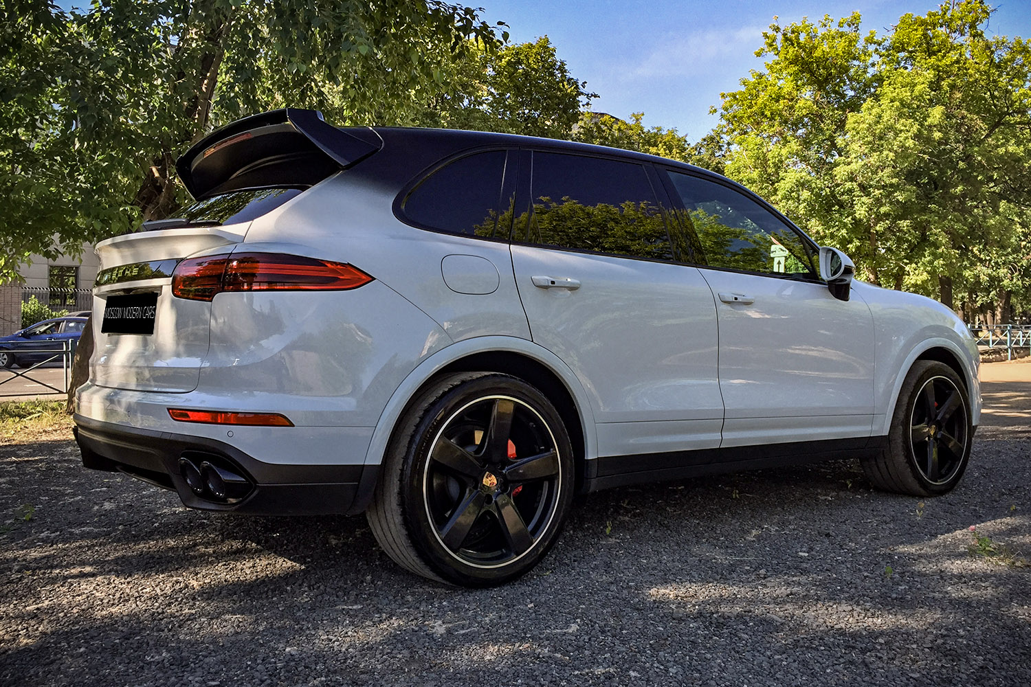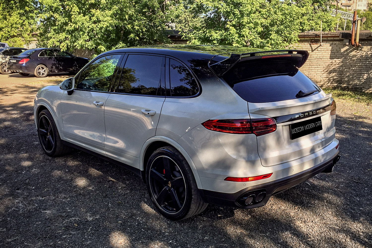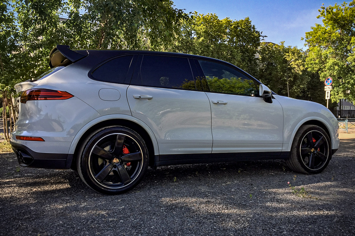 Этому рестайлинговому Cayenne в комплектации Platinum Edition мы создали привлекательный вид с помощью двухцветной окраски кузова. Чёрная крыша с плавным переходом на задних стойках отлично подошла к оригинальным колёсным дискам Classic design. Все решётки в переднем бампере и низ зеркал окрашены в чёрный глянец, а а на заднюю часть кузова установлены дополнительные элементы в стиле Techart. Индивидуально мы изготовили накладку с логотипом на крышку багажника и установили черные насадки от модели Турбо. Также был произведен чип-тюнинг двигателя.